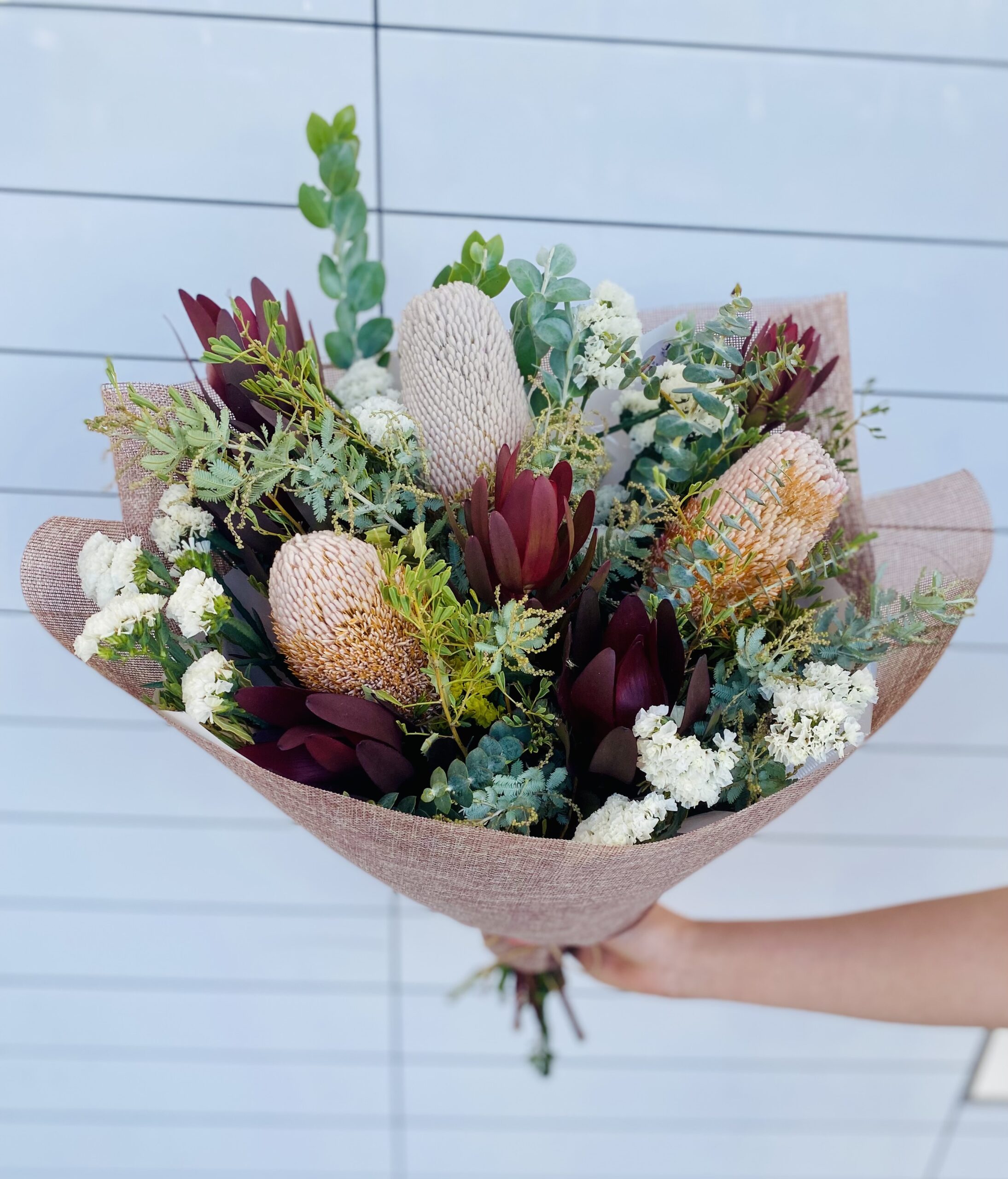 The Native Elegance Bouquet features a stunning arrangement of seasonal native flowers and lush Australian greenery, all beautifully wrapped in brown kraft paper or any colour paper and ribbon of your choice. This bouquet is perfect for adding a touch of natural beauty and elegance to any occasion.