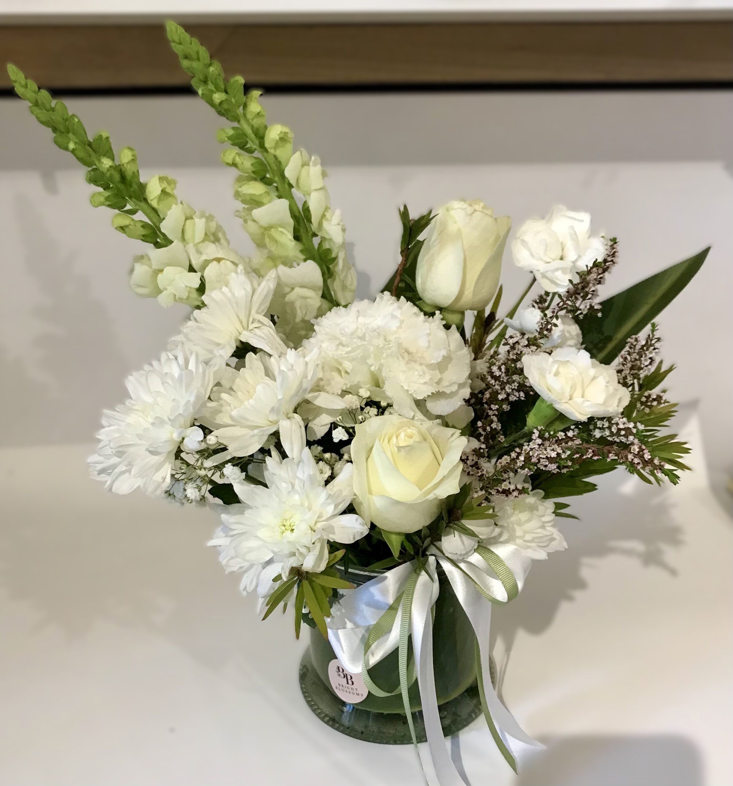 The White Serenity Vase features a captivating arrangement of beautiful mixed white flowers, complemented by lush green foliage. Elegantly presented in a clear round glass vase, this arrangement showcases the purity and elegance of the flowers. Ideal for expressing sympathy, celebrating special occasions, or simply adding a touch of calm and grace to any space, this arrangement brings a sense of tranquility and beauty to its surroundings.